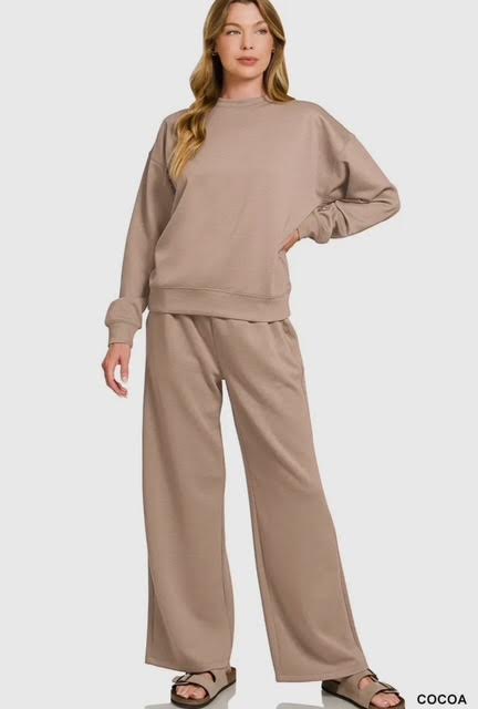Matching set with pants and a sweatshirt, perfect for cozy days.